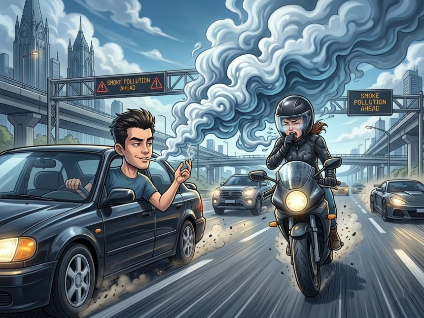 Aktivitas merokok di jalan raya sering kali merugikan pengguna jalan lain, terutama para pengendara motor. Abu rokok yang terbang tertiup angin dapat masuk ke dalam helm dan melukai mata pengendara di belakang. Beberapa kasus bahkan menunjukkan abu panas tersebut menyebabkan iritasi mata yang cukup serius bagi korban. Kondisi mata yang perih secara mendadak bisa menyebabkan pengendara motor terjatuh karena kehilangan pandangan.